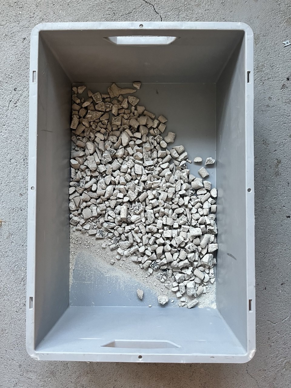 Die Ausscheidungen werden im Labor des Instituts chemisch-mineralogisch untersucht. Die Analysen geben Aufschluss darüber, welche Bindemittel für das Vorhaben geeignet sein könnten. Mit einer größeren Menge an Mehlwurm-Ausscheidungen, welche im Atelier produziert werden, werden nach den ersten Mischversuchen mit verschiedenen Bindemitteln, unter anderem zementfreien Bindemitteln , sog. Geopolymeren, Ausscheidungen durch geeignete Pelletierung in Granulat überführt. Beide Produkte werden schließlich hinsichtlich ihrer mechanischen Eigenschaften am IBP untersucht. Auf die Analysen folgen die ersten Versuche. Geeignete Gemische werden in Form gebracht, während unterschiedliche Mischverfahren getestet werden.