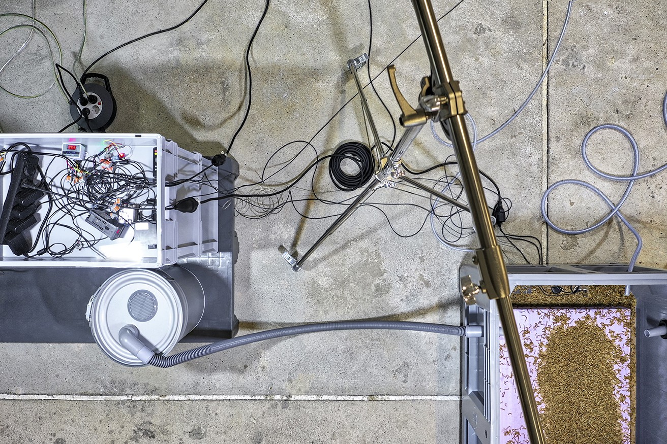 HYBRIS isn’t just technical—it’s deeply philosophical. Zschiedrich highlights the fragility of her ecosystem: if conditions shift—temperature drops or humidity changes—the worms stop processing the polystyrene, and the artistic outcome varies significantly. “The artist is challenged to do justice to each individual mealworm, as well as to the swarm as a whole,” reads the project documentation—revealing nature’s unpredictability and the shifting power dynamics within collective systems.