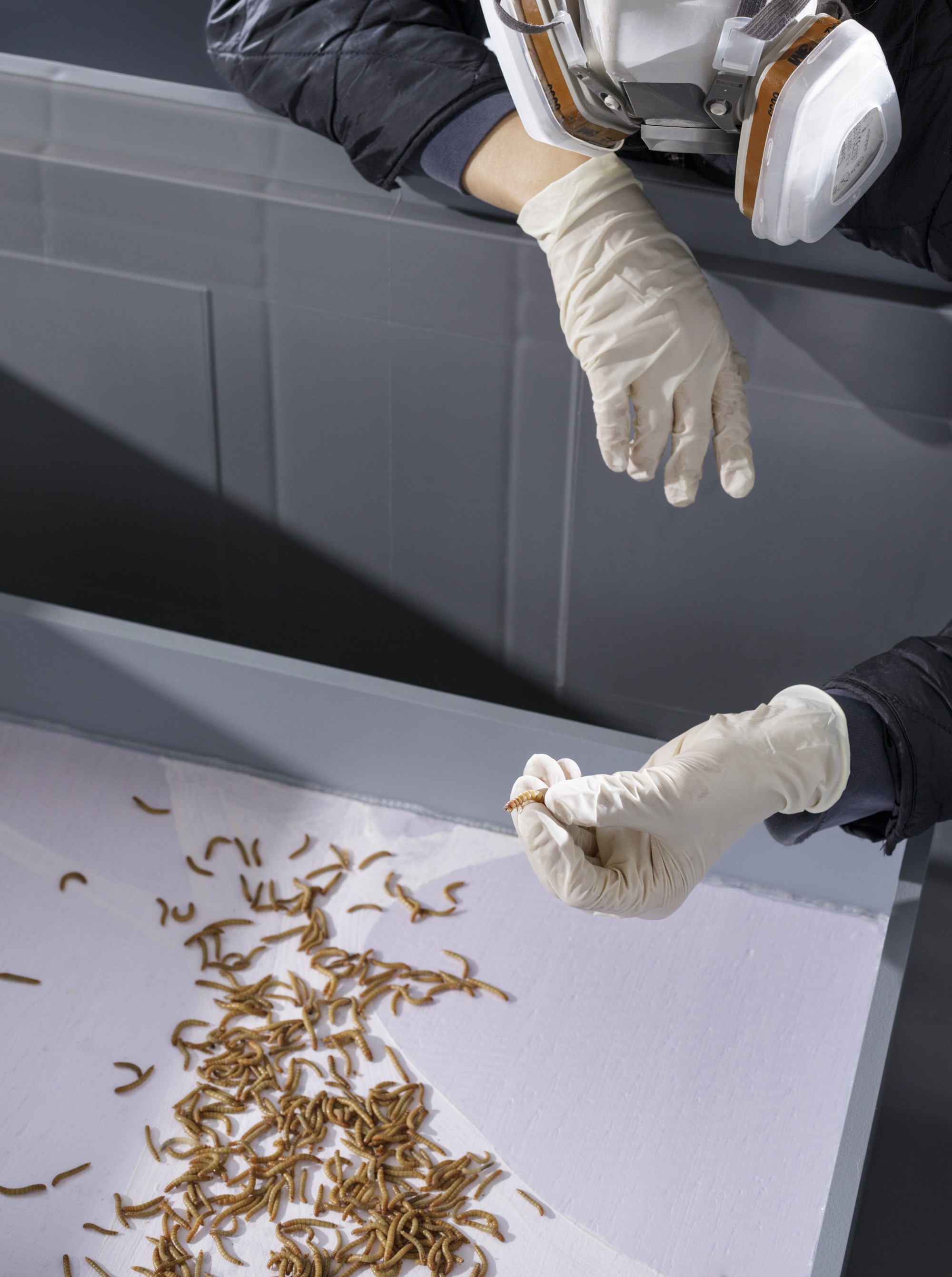 Durch das Zusammenbringen von unterschiedlichen Bindemitteln und dem Kot von Mehlwürmern werden innovative Materialien erzeugt, welche als Baustoffe oder als Leichtzuschlag genutzt werden können. Mit diesen Baustoffen ist es möglich, Skulpturen zu erschaffen, die durch unterschiedliche Fertigungsprozesse geformt werden können.