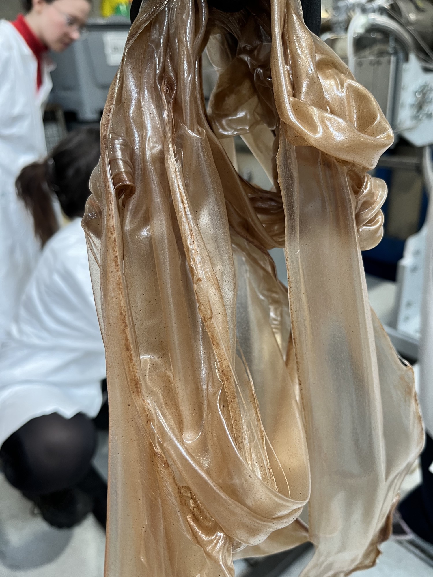 Im Rahmen eines einwöchigen Workshops wurden die Teilnehmerinnen aktiv in den Entwicklungsprozess der GEOBRIS-Formulierung eingebunden – einem innovativen Material auf Basis von Biokunststoff und Mehlwurm-Dung. Brigita Kasperaitė, Corinna Wolff, Taisiia Kravchenko und Olena Melnyk haben das Material durch künstlerisch-experimentelles Arbeiten untersucht, reflektiert und weiterentwickelt. Die Maßnahme wurde von der FUNKEN-Akademie initiiert und mit Steuermitteln auf Grundlage des vom Sächsischen Landtag beschlossenen Haushalts mitfinanziert. Vom MERGE-Team begleiteten folgende Personen den Workshop: